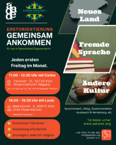 Ab dem 06.03. bitten wir das Angebot „Erstorientierung“ jeden ersten Freitag des Monats als offenes Angebot für alle zusätzlich abends (18:00 – 19:30 Uhr) an. Das Angebot dient als Einführung über das Einleben in Deutschland. Spracherwerb und Alltagsthemen stehen dabei im Vordergrund.