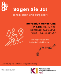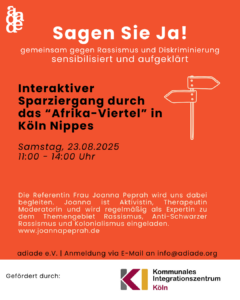 zwei Termine: am 23.08. (interaktiver Sparziergang durch das „Afrika-Viertel“) und am 13.09.2025 (interaktive Wanderung in Köln)