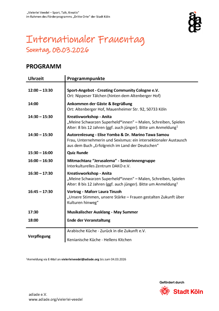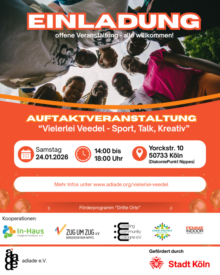 Mit unserem Projekt „Vielerlei Veedel – Sport, Talk, Kreativ“ wollen wir Räume für Begegnung, Bewegung, Austausch und neue Ideen schaffen. Ob beim Sport (Vielerlei Veedel – Sport), im gemeinsamen Gespräch (Vielerlei Veedel – Talk) oder in kreativen Workshops (Vielerlei Veedel – Kreativ) – Menschen mit und ohne internationale Familiengeschichte sollen zusammenkommen, voneinander lernen und das nachbarschaftliche Miteinander im Stadtbezirk Nippes bzw. in Köln lernen.